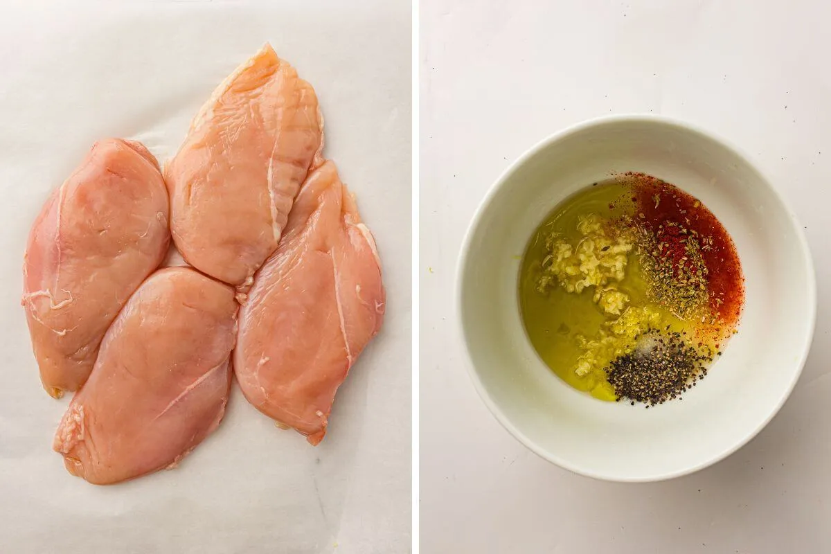 Step 4: In a small bowl, mix together the olive oil, minced garlic, lemon zest, lemon juice, salt, black pepper, oregano, and paprika until combined.