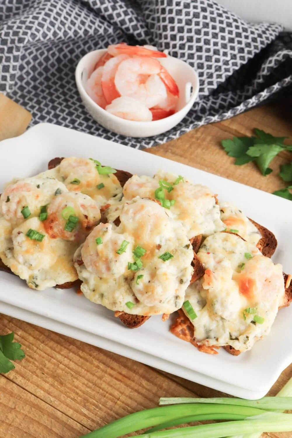 Baked shrimp toast is a warm, savory appetizer made with chopped shrimp, garlic, cream cheese, and parmesan, spooned over toasted bread and baked until bubbly. It's quick, easy to serve, and makes the perfect appetizer.