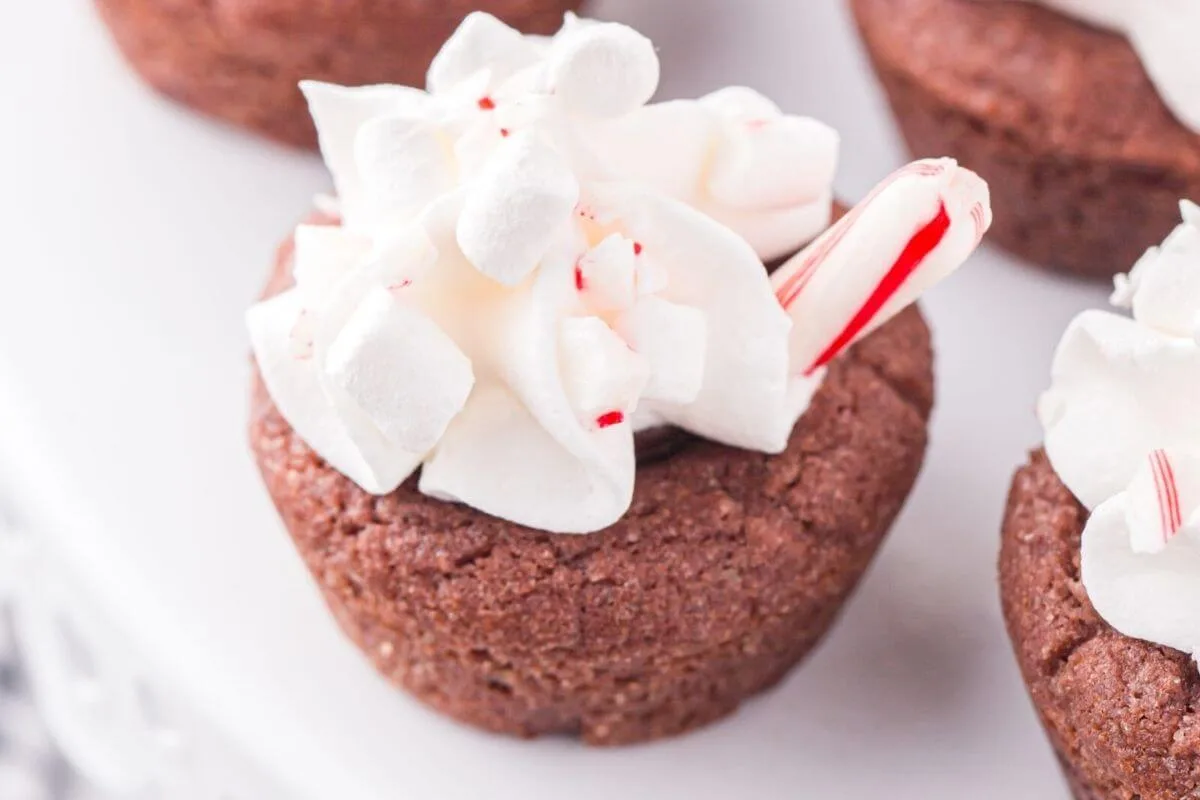Hot chocolate flavored cookie cups topped with marshmallows and peppermint candy canes is the perfect treat to enjoy over the holidays.