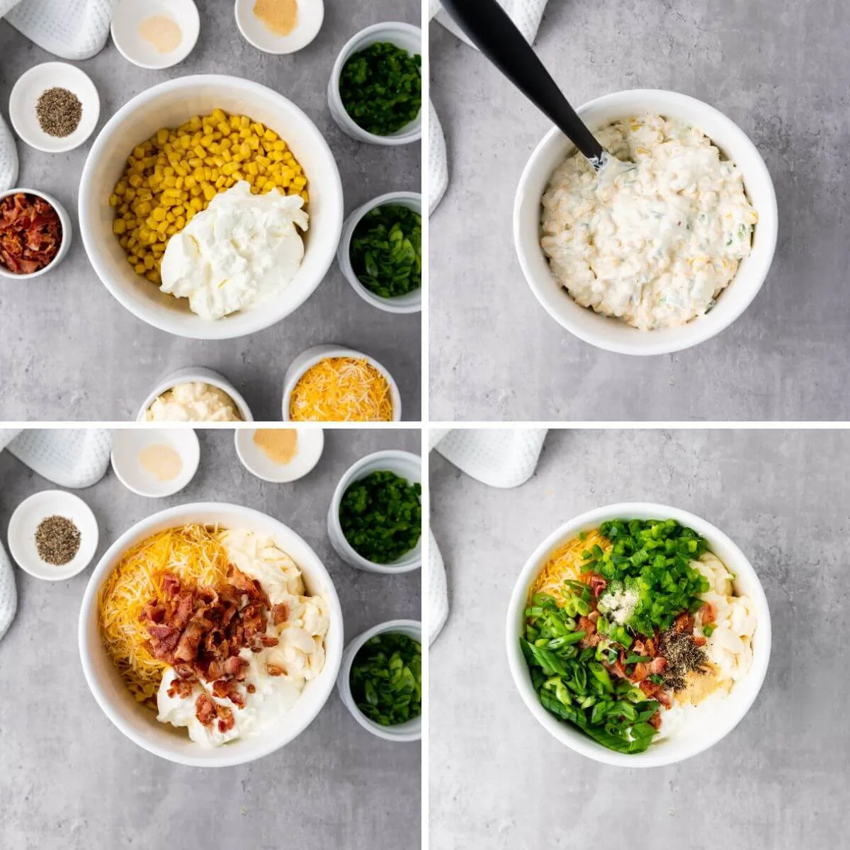 Step 4: In a medium to large bowl, add the drained corn, sour cream, mayonnaise, shredded cheese, chopped bacon, scallions, jalapeno, black pepper, garlic powder, and onion powder.