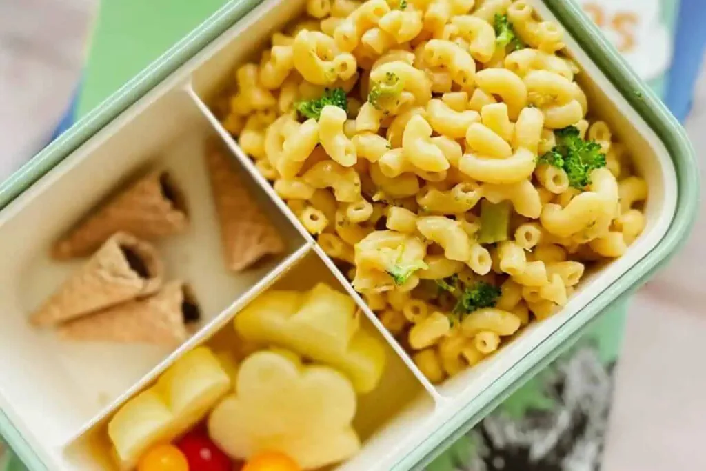 Vegan mac and cheese with broccoli, sweet fruit, veggies, and a bit of chocolate for dessert, this is a simple and fun school lunch to make for the kids.