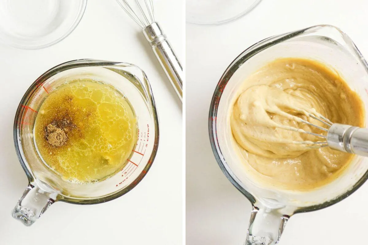 Step 2: Slowly add the warm water one tablespoon at a time, whisking after each addition. As you whisk, the dressing will loosen and turn creamy and smooth. Stop once it reaches your preferred consistency.