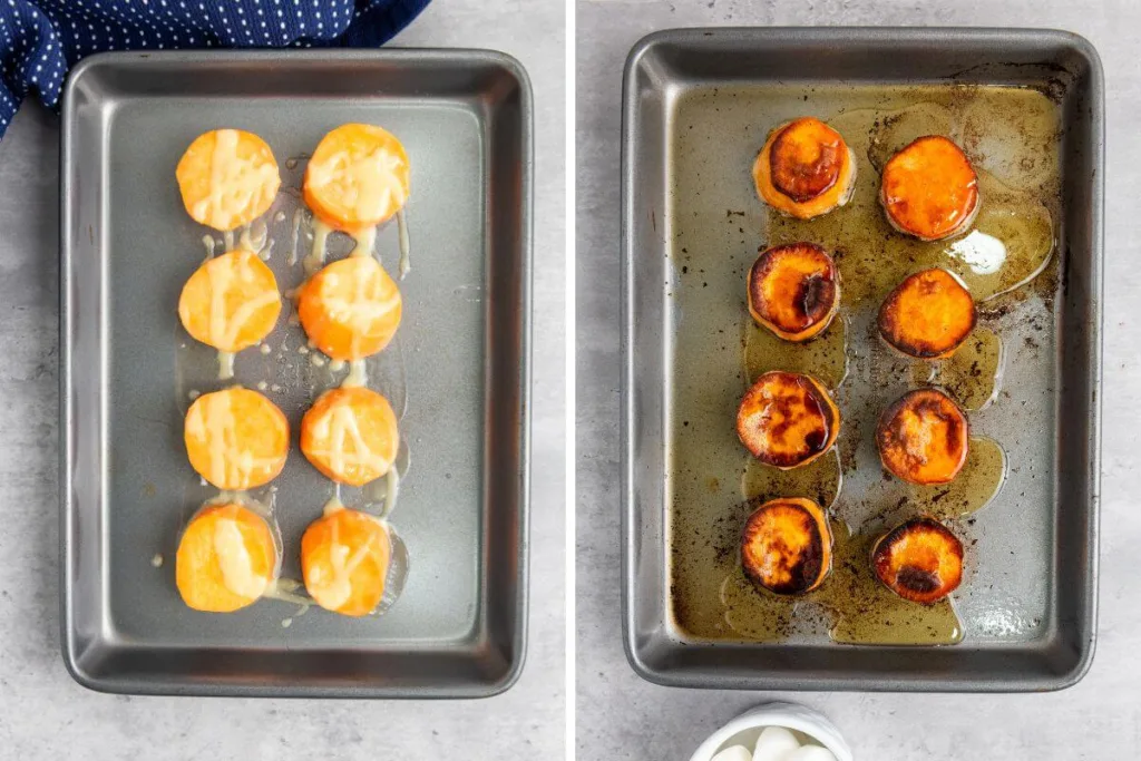 - Arrange the coated sweet potato slices on the prepared baking sheet in a single layer. Bake for 15 minutes, then flip each slice and continue baking for another 10 minutes, until tender.