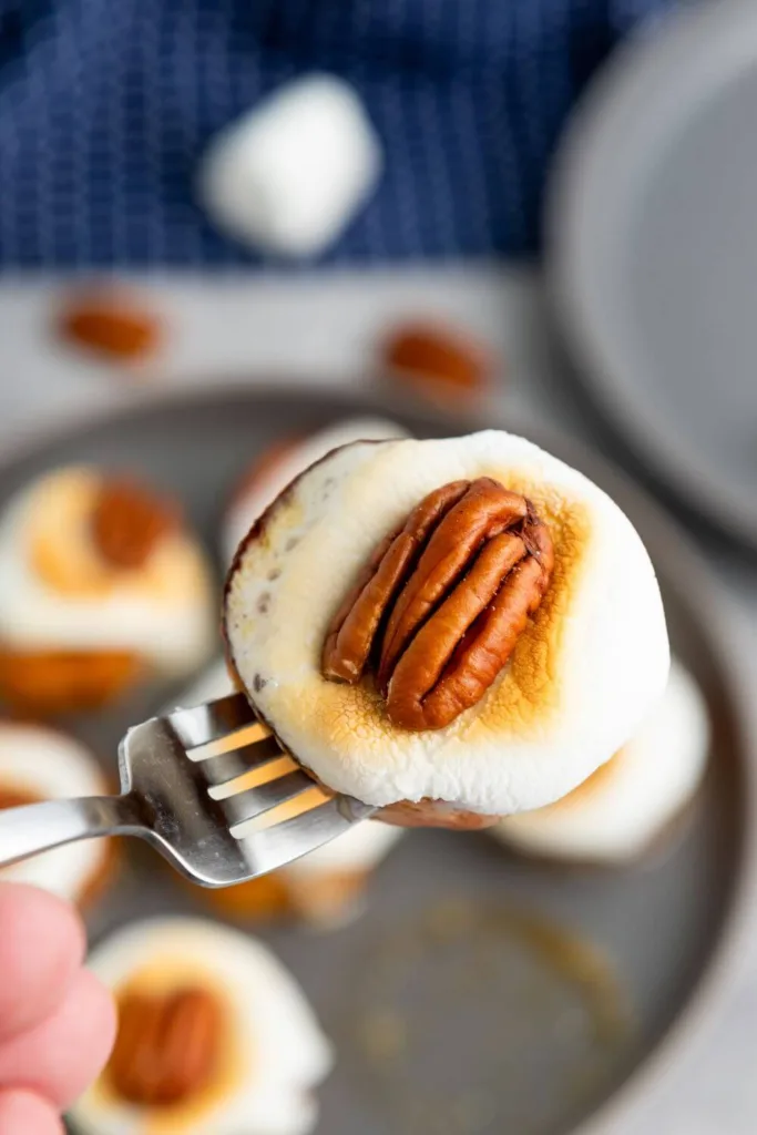 - Remove from the oven and gently press one pecan half on top of each toasted marshmallow.