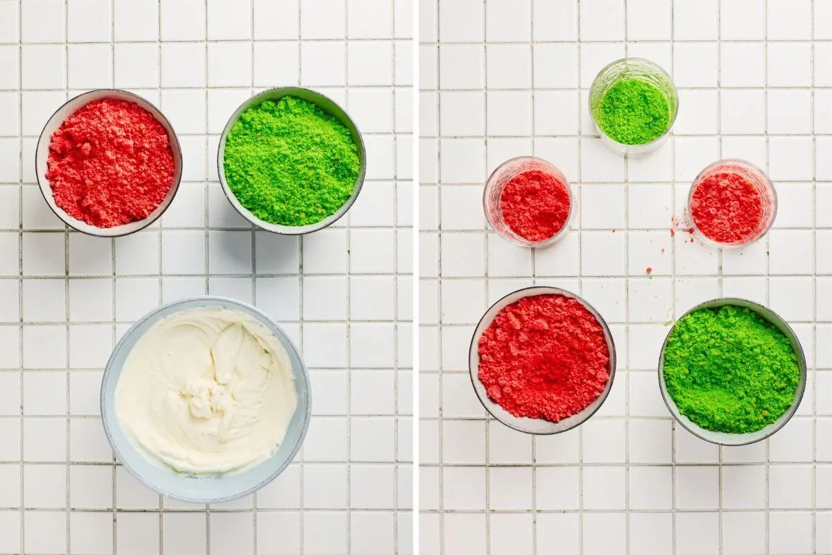 Step 1: Prepare both cakes according to the recipe or box instructions. Before baking, add a few drops of green food coloring to the white cake. Once baked, allow them to cool completely. When they are fully cooled, crumble the red cake and the green cake separately into soft chunks. This helps create the layered look inside the trifle cups.