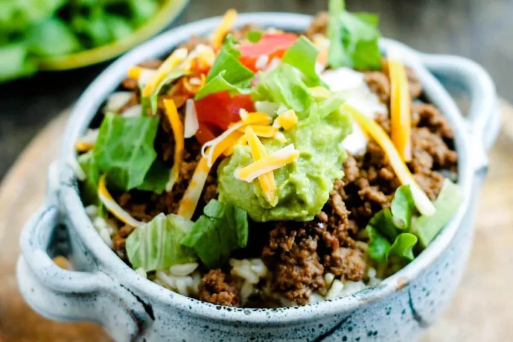 A close-up of a bowl filled with seasoned ground beef, rice, shredded cheese, lettuce, chopped tomatoes, and a dollop of guacamole, served in a ceramic dish.