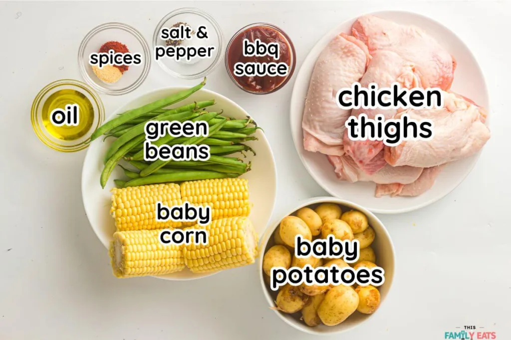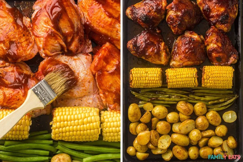 Step 5: Bake for 30 to 35 minutes, or until the chicken reaches an internal temperature of 165°F and the skin is golden and crisp. Potatoes should be fork-tender, and the corn lightly roasted.