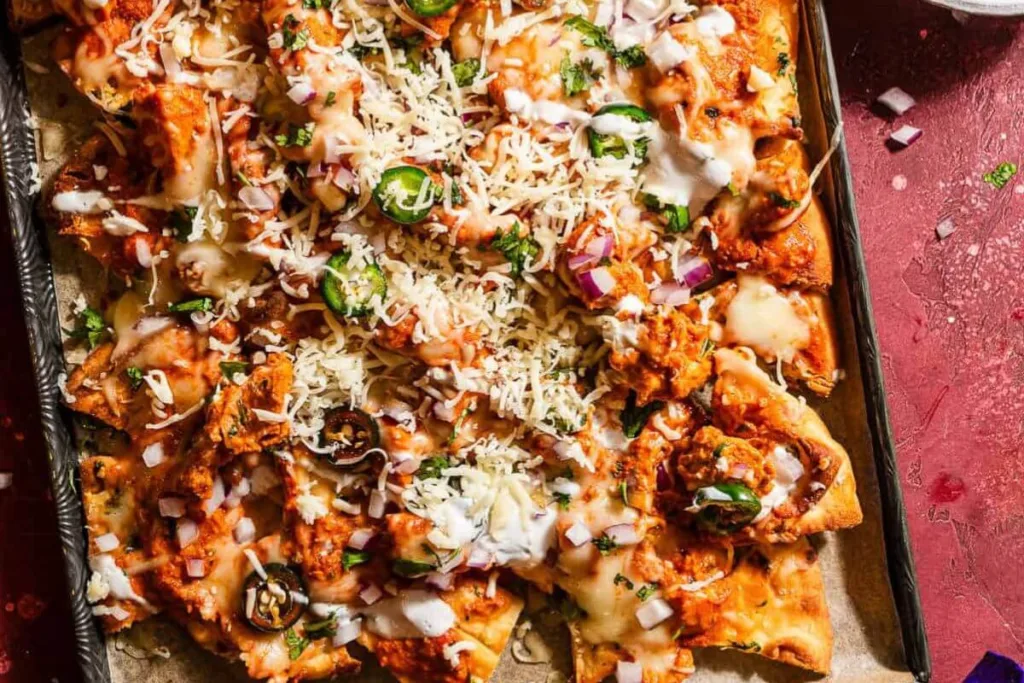 A 30 minute game day food idea, this dish is made with toasted garlic naan "chips" that are covered with cheese, butter chicken, and the classic nacho toppings.