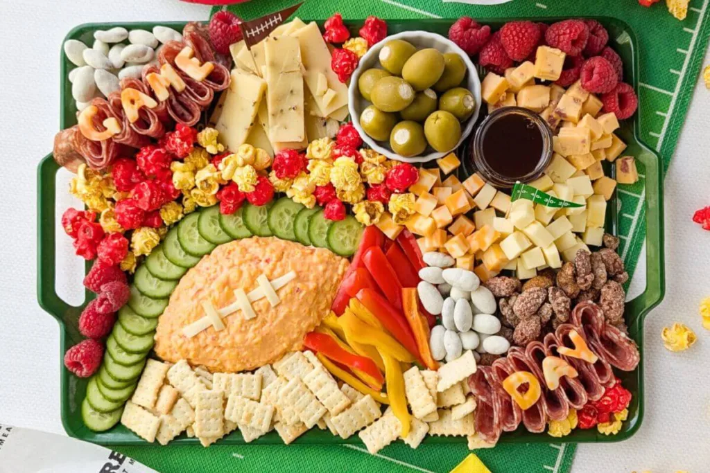 Want to impress the fans? This game day charcuterie board will certainly do the trick! Add your favorite crackers, veggies, sweet, meats, and co much more. The football shaped cheese ball is always a hit.